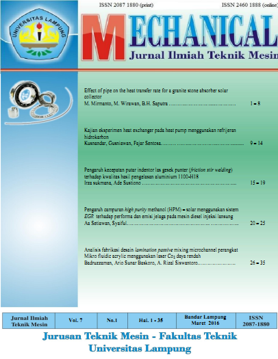 Mechanical (e-ISSN 2460-1888 and p-ISSN 2087-1880) is a peer-reviewed journal that publishes scientific articles from the disciplines of mechanical engineering, which includes the field of study (peer) material, production and manufacturing, construction and energy conversion. Articles published in the journal Mechanical include results of original scientific research (original), and a scientific review article (review). Mechanical journal published by University of Lampung and managed by Department of Mechanical Engineering, Faculty of Engineering for publishing two periods a year, in March and September . Editors receive manuscripts in mechanical engineering from various academics, researchers and industry practitioners. The authors in the Journal of Mechanical derived from various Higher Education institutions, especially universities outside the University of Lampung and national research institutes.Editorial Board of Journal of Mechanical stated that online media is both a scientific and specialized publishing scientific articles on original scientific research results (original) and review the field of mechanical engineering science.